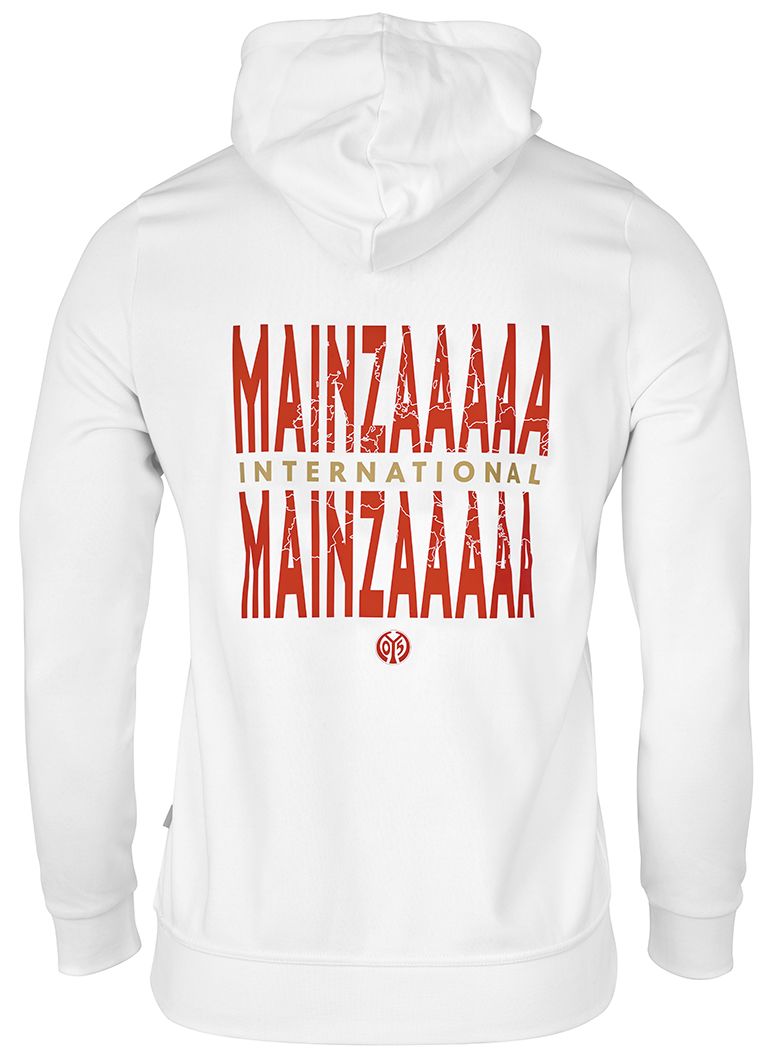 Der weiße Unisex-Hoodie mit „Mainzaaaaa International“-Schriftzug ist aus angenehm weichem Material gefertigt und eignet sich ideal für Alltag und Freizeit. Klassischer Schnitt, sportlicher Look und klare Botschaft für alle Mainz 05 Fans.