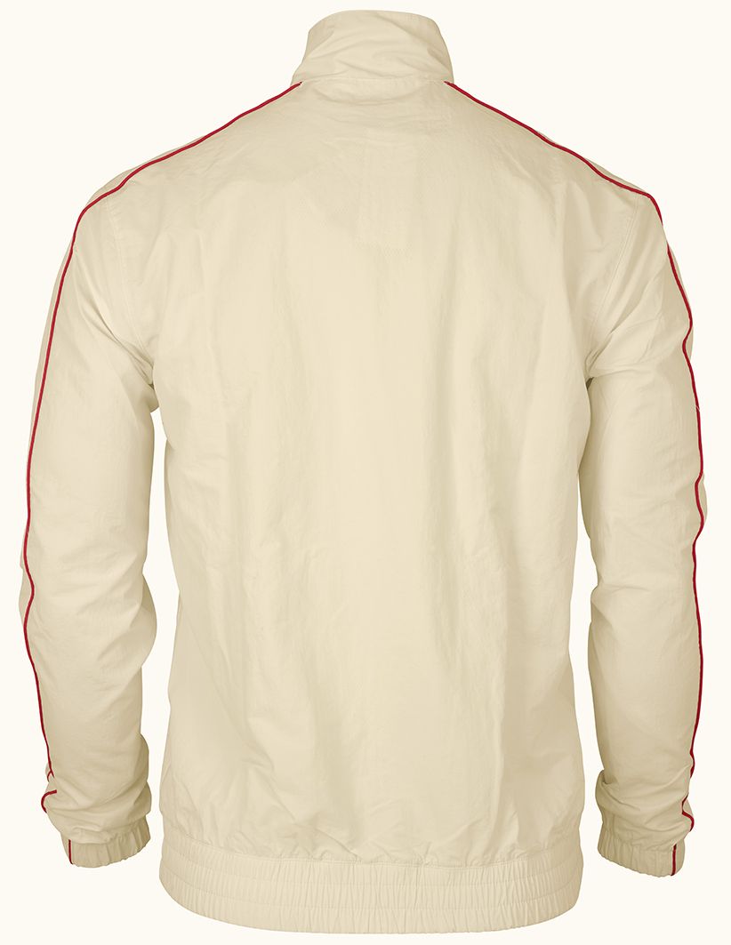 Diese sportliche Windjacke überzeugt durch ihr modernes Design und hohen Tragekomfort. Der helle Off-White Ton wird durch markante rote Kontraste an Reißverschluss, Nähten und Ärmeln stilvoll ergänzt und verleiht der Jacke einen dynamischen Look. Das dezente Logo-Patch auf der Brust setzt einen sportlichen Akzent.